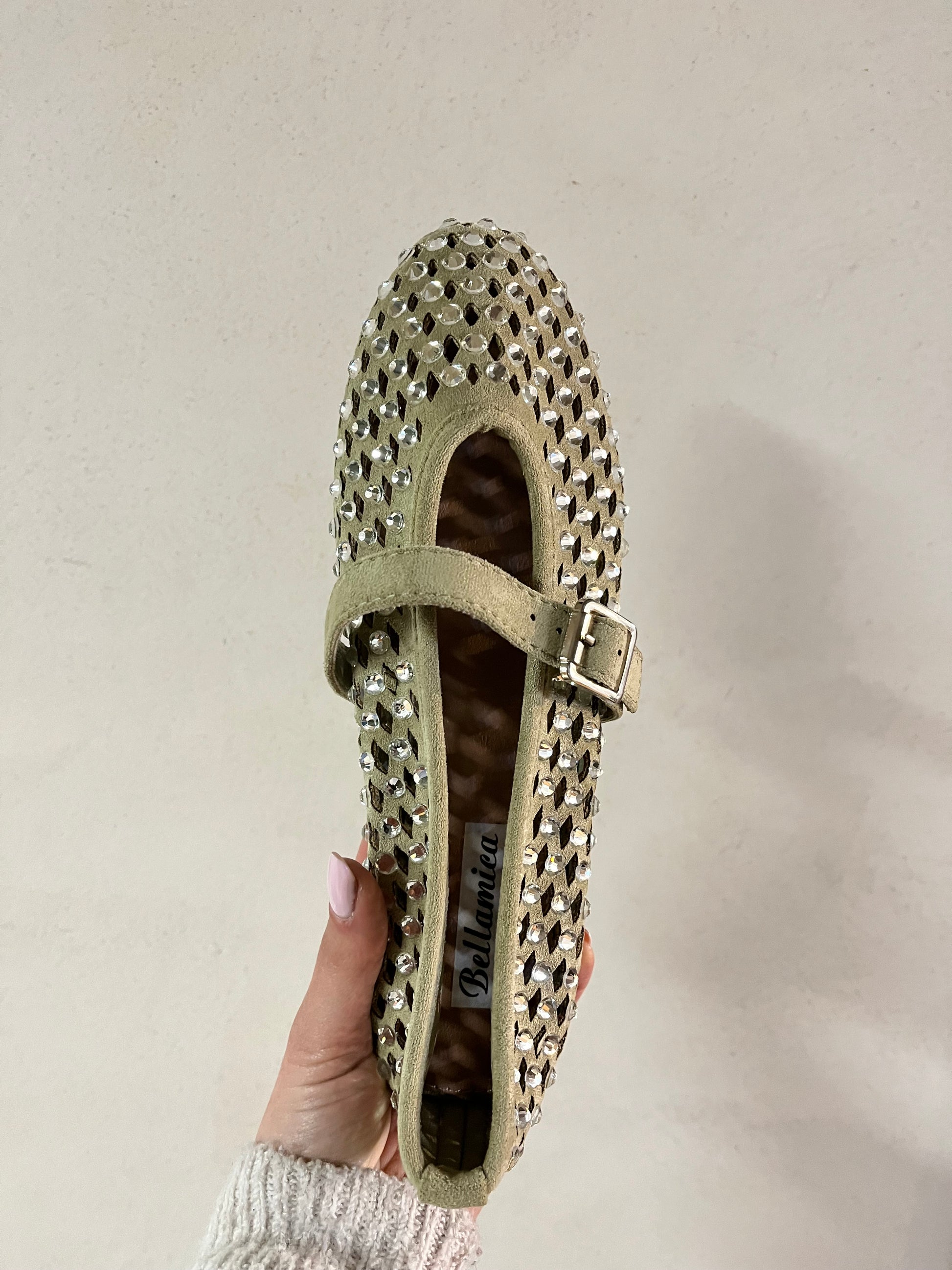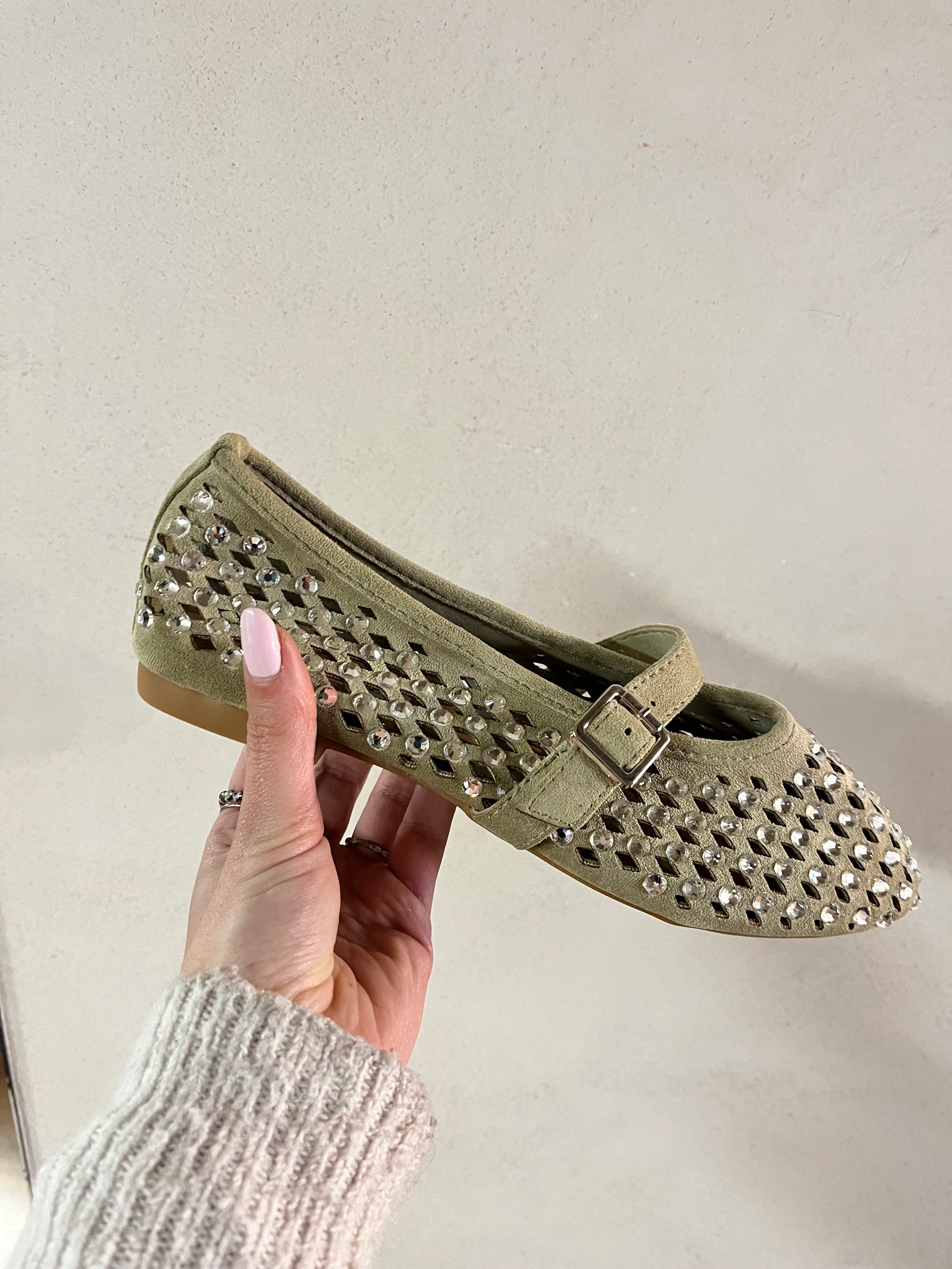 Ballerina in eco suede con applicazioni brillanti. Tessuto morbido e calzata regolare.